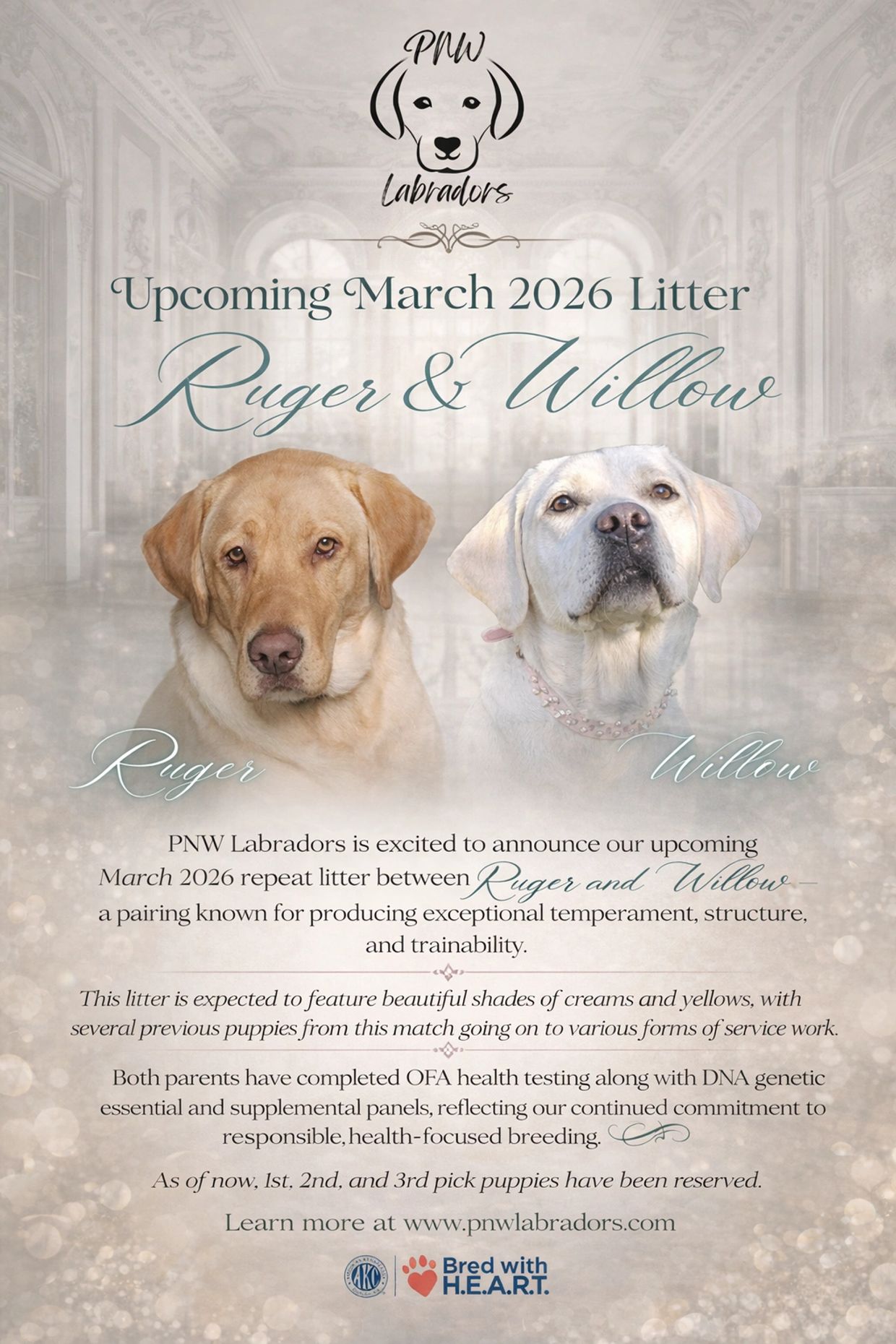 Our next PNW Labradors litter is due March 2026 — a repeat pairing between Ruger and Willow that has produced exceptional puppies in both temperament and structure. This upcoming litter will feature beautiful shades of yellows and creams, with several previous puppies from this pairing going on to various forms of service work. At this time, 1st, 2nd, and 3rd pick puppies have already been reserved.